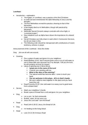 The first Methodists revived the practice, drawing on that of the Moravians.