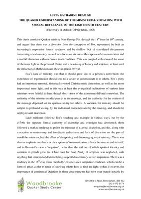 This thesis considers Quaker ministry from George Fox through the 18th into the 19th century, and argues that there was a diversion from the conception of Fox, represented by both an increasingly oppressive formal structure, and by shallow lack of considered discernment concerning vocal ministry; as well as a focus on silence at the expense of communication and a morbid obsession with one’s own inner condition. This was coupled with a loss of the sense of the inner light as the personal Christ, and a devaluing of history and scripture, at least until the influence of Methodism and the evangelical revival.
