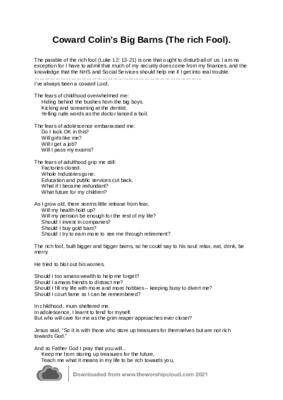 The parable of the rich fool (Luke 12: 13-21) is one which ought to disturb all of us. I am no exception for I have to admit that much of my security does come from my finances, and the knowledge that the NHS and Social Services should help me if I get into real trouble. Meditating on these thoughts leads me prayerfully back to our Lord as the only sure source of security for the future...