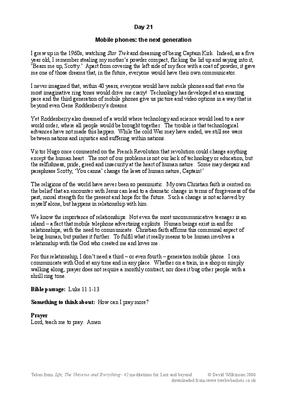 Thoughts taken from TV, Books and life experiences on various topics and given a Christian slant to stimulate thoughts. The topic here for Day 21 is 'The Mobile Phone'.