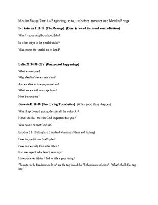 A Bible Study which relies heavily on discussion rather than leading. Using the film 'Moulin Rouge' as a starting point and then looking at a variety of passages (which can be obtained from the web in a variety of different translations) There are questions to help start discussion - some are harder than others.