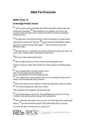 The double picture is put together in another of Mark’s ‘sandwiches’. Peter arrives in the high priest’s courtyard; but the reader already knows that Jesus has prophesied that he will renounce him three times. Jesus is then accused before the high priest of being, among other things, a false prophet. After the verdict, Jesus is taunted: he’s such a hopeless prophet that when blindfold he can’t tell who’s hitting him. We then switch back to Peter: he does exactly what Jesus had said he would. That night, says Mark, Jesus was vindicated as a true prophet.