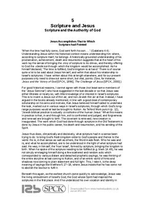 ‘When the time had fully come, God sent forth his son . . .’ (Galatians 4.4). Understanding Jesus within his historical context means understanding him where, according to scripture itself, he belongs. A historically grounded understanding of his proclamation, achievement, death and resurrection suggests that at the heart of his work lay the sense of bringing the story of scripture to its climax, and thereby offering to God the obedience through which the kingdom would be accomplished. As he himself declared, ‘The time is fulfilled; God’s kingdom is at hand.’ There is of course quite a lot to be said about Jesus himself, and within that about his relationship to Israel’s scriptures. I have written about this at length elsewhere, and for our present purposes only need to draw out some short, but vital, points. (See, for instance, Jesus and the Victory of God [SPCK, 1996]; The Challenge of Jesus [SPCK, 2000].)...