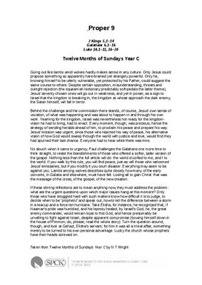 Going out like lambs amid wolves hardly makes sense in any culture. Only Jesus could propose something so apparently hare-brained yet strangely powerful. Only he, knowing himself to be utterly vulnerable, yet protected by his Father, could suggest the same course to others. Despite certain opposition, misunderstanding, threats and outright rejection (the squeamish lectionary predictably soft-pedals the latter theme), Jesus’ seventy chosen ones will go out in weakness, and yet in power, as a sign to Israel that the kingdom is breaking in, the kingdom at whose approach the dark enemy, the Satan himself, will fall in terror...