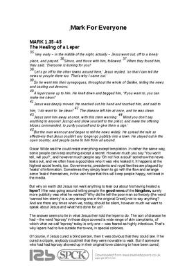 But why on earth did Jesus not want anything to leak out about his having healed a leper? If he was going around telling people the good news of the kingdom, surely more publicity was what he wanted? Why did he tell the poor man so fiercely (the word ‘warned him sternly’ is a very strong one in the original Greek) not to say anything? And are there any times when we, today, should be silent, however much we want to speak about Jesus and what he’s done for us...