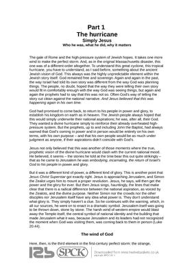 The gale of Rome and the high-pressure system of Jewish hopes. It takes one more wind to make the perfect storm. And, as in the original Massachusetts disaster, this one was of a different order altogether. To understand this great cyclone, this tropical hurricane, you have to understand, as I said before, something about the ancient Jewish vision of God. This always was the highly unpredictable element within the Jewish story itself. God remained free and sovereign. Again and again in the past, the way Israel had told its own story was different from the way God was planning things. The people, no doubt, hoped that the way they were telling their own story would fit in comfortably enough with the way God was seeing things, but again and again the prophets had to say that this was not so. Often God’s way of telling the story cut clean against the national narrative. And Jesus believed that this was happening again in his own time...
