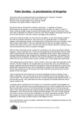 In this short reflection/sermon (880 words), the events of Palm Sunday are seen as parts of a pre-planned ceremony which amounted to Jesus proclaiming his Kingship. Later events and ceremonies in Holy week reveal the particular kind of king he was going to be. How this differed from their expectations is explained as is its importance considered for today's Christians.