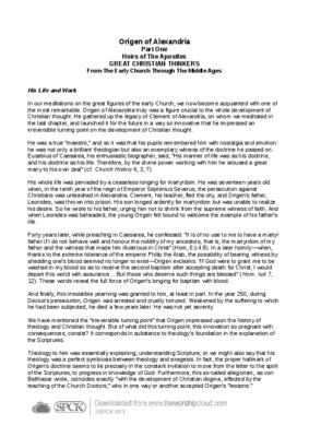 In our meditations on the great figures of the early Church, we now become acquainted with one of the most remarkable. Origen of Alexandria truly was a figure crucial to the whole development of Christian thought. He gathered up the legacy of Clement of Alexandria, on whom we meditated in the last chapter, and launched it for the future in a way so innovative that he impressed an irreversible turning point on the development of Christian thought…