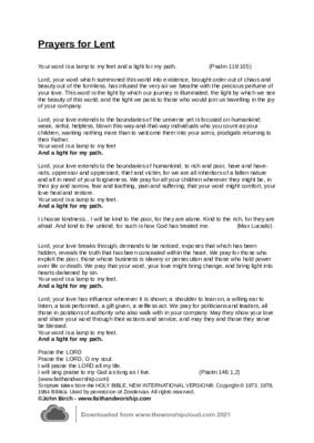 Prayers for use throughout the season of Lent, including responses and verses from the Psalms. Lord, your love extends to the boundaries of the universe yet is focused on humankind; weak, sinful, helpless, blown this-way-and-that-way individuals who you count as your children, wanting nothing more than to welcome them into your arms, prodigals returning to their Father. Your word is a lamp to my feet ALL: And a light for my path.
