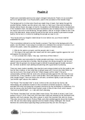 This reflection on Psalm 2 was originally written as a short talk/sermon (1165 words). It is seen as a royal Psalm sung at coronations. It emphasises that the position of Kings and rulers is under God. It serves to remind them of this and as a warning of the consequences of forgetting this.