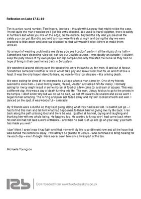 Ten is a nice round number. Ten fingers, ten toes – though with Leprosy that might not be the case, I’m not quite the man I was before I got this awful disease. We used to travel together, there is safety in numbers and when you live on the edge, on the outside, beyond the city wall you need all the safety you can get. Bandits and wild animals were threats at night and during the day we were expected to hide away and keep our distance so that we wouldn’t infect others or make them unclean.