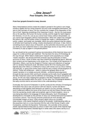 Many interpretations tend to create the subject’s portrait in the author’s own image. Irenaeus applies the four living creatures not only to the evangelists themselves, but also to their portraits of Jesus: the four symbols are ‘images of the disposition of the Son of God’, depicting something of the meaning of Jesus – the lion his royal power, the ox his sacrifice, the human his human coming, and the eagle his Spirit (Against the Heresies, III.11.8–9). Just as you cannot have history without interpretation, so you cannot have biography without characterization. When the subject has changed the author’s life, and the author writes to change the reader’s, interpenetration of author, subject, and reader are inevitable. When the author believes that the subject is still alive and inspiring his writing, creative development will ensue. In fact, there is something elusive about Jesus of Nazareth; as the authorities discovered, just when you think you have nailed him down or even piled large stones on top of him, he has a tendency to pop up again in unexpected places!…