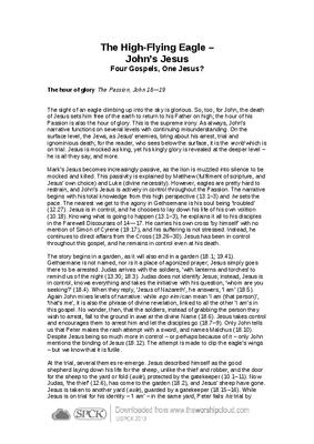 The sight of an eagle climbing up into the sky is glorious. So, too, for John, the death of Jesus sets him free of the earth to return to his Father on high; the hour of his Passion is also the hour of glory. This is the supreme irony. As always, John’s narrative functions on several levels with continuing misunderstanding. On the surface level, the Jews, as Jesus’ enemies, bring about his arrest, trial and ignominious death; for the reader, who sees below the surface, it is the world which is on trial. Jesus is mocked as king, yet his kingly glory is revealed at the deeper level – he is all they say, and more…