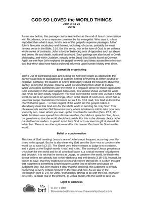 As we saw before, this passage can be read either as the end of Jesus’ conversation with Nicodemus, or as a separate comment by the evangelist. Who says it, is less important than what it says, for it is one of this gospel’s supreme passages, full of John’s favourite vocabulary and themes, including, of course, probably the most famous verse in the Bible, 3:16…