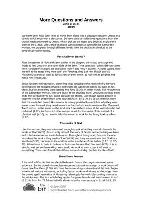 We have seen how John likes to move from signs into a dialogue between Jesus and others which ends with a discourse. So here, we start with three questions from the crowd, each answered by Jesus, which pick up the signs and begin to explore the themes they raise. Like Jesus’ dialogue with Nicodemus and with the Samaritan woman, we progress through different levels from the obviously physical to the deeper spiritual meaning…