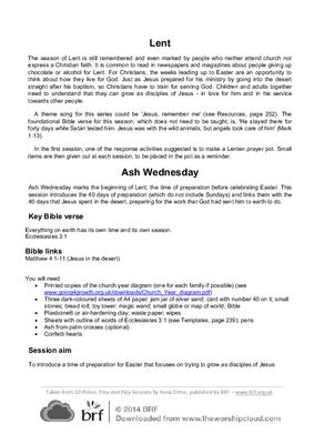 Ash Wednesday marks the beginning of Lent, the time of preparation before celebrating Easter. This session introduces the 40 days of preparation (which do not include Sundays) and links them with the 40 days that Jesus spent in the desert, preparing for the work that God had sent him to earth to do.