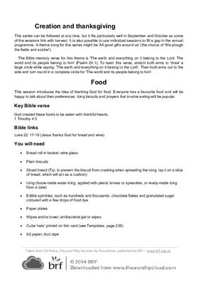 This session introduces the idea of thanking God for food. Everyone has a favourite food and will be happy to talk about their preferences. Icing biscuits and prayers that involve eating will be popular.