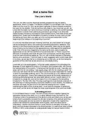 The Lion, the Witch and the Wardrobe carefully prepares the way for Aslan’s appearance. When in Chapter 7 Mr Beaver confides ‘in a low whisper’ that ‘They say Aslan is on the move’ (p. 141), we are given a glimpse of what is instantly evoked by the name for the children. They do not know who Aslan is, ‘any more than you do’, as Lewis tells the reader, but ‘some enormous meaning’ is called up, like something heard or glimpsed in a dream that mysteriously promises to give shape to an otherwise chaotic bundle of events or impressions. Edmund feels horror, Peter feels ‘brave and adventurous’, Susan has the sensation of a scent or a strain of music, and Lucy ‘got the feeling you have when you wake up in the morning and realize that it is the beginning of the holidays or the beginning of summer’...