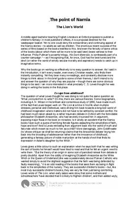 A middle-aged bachelor teaching English Literature at Oxford proposes to publish a children’s fantasy: in most publishers’ offices, it is a proposal destined for the wastepaper basket. Yet no one could deny the extraordinary and continuing appeal of the Narnia stories – to adults as well as children. The enormous recent success of the series of films based on the books testifies to this. And even the ferocity of some critics of the books (about which there will be more to be said later) bears witness to their influence. Philip Pullman’s powerful trilogy, His Dark Materials, is confessedly part of a counter-campaign 1 – as if recognizing that, for once, God has the best tunes and the devil (or rather the world of strictly secular morality and aspiration) needs to catch up in imaginative terms...