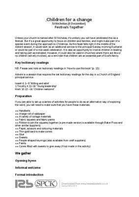 Unless your church is named after St Nicholas, it’s unlikely you will have celebrated this as a festival. But it’s a great opportunity to focus on children and families, and might make part of a special event during the approach to Christmas. As this feast falls right in the middle of the Advent season, it would work as an additional service to the principal Sunday morning Eucharist or could be part of a mid-week celebration. It is also an opportunity to involve children in leading and taking part as indicated. However, it could also be used in churches where there are few or no children actively involved, as a reminder that children are an essential part of God’s family...