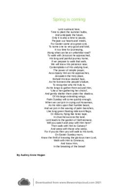 A poem for Lent and on to Easter Sunday. An invitation to walk with Jesus as he journies to Jerusalem and to the cross. It encourages you to go the whole way of Christ's painful journey home. Then to know his presence in the breaking of bread on Easter Sunday morning. If you will walk with Him to the cross He will walk with you to Emmaus. By Audrey Hogan