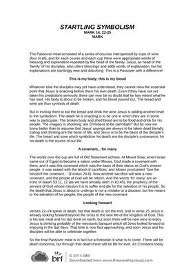 The Passover meal consisted of a series of courses interspersed by cups of wine (four in all), and for each course and each cup there were appropriate words of blessing and explanation repeated by the head of the family. Jesus, as head of the ‘family’ of his disciples, also utters blessings and adds words of explanation, but his explanations are startlingly new and disturbing…