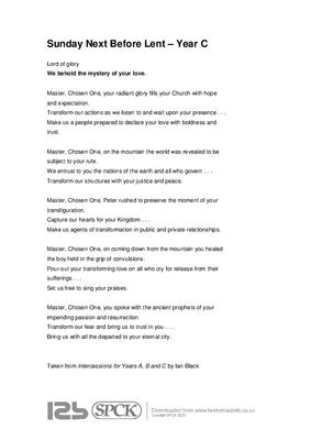 Lord of glory We behold the mystery of your love. Master, Chosen One, your radiant glory fills your Church with hope and expectation. Transform our actions as we listen to and wait upon your presence . . .