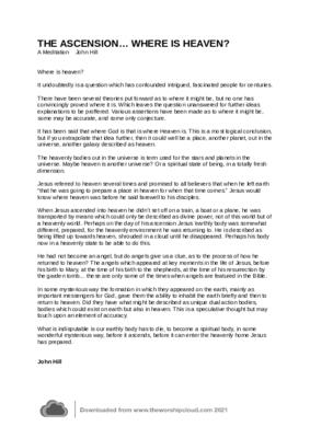 Where is heaven? It undoubtedly is a question which has confounded intrigued, fascinated people for centuries. There have been several theories put forward as to where it might be, but no one has convincingly proved where it is. Which leaves the question unanswered for further ideas explanations to be proffered. Various assertions have been made as to where it might be, some may be accurate, and some only conjecture .It has been said that where God is that is where Heaven is. This is a most logical conclusion, but if you extrapolate that idea further, then it could well be a place, another planet, out in the universe another galaxy described as heaven, the heavenly bodies out in the universe is a term used for the stars and planets in the universe. May be heaven is another universe? Or a spiritual state of being, in a totally fresh dimension. Jesus referred to heaven, several times and promised to all believers when he left the earth ‘that he was going to prepare a place in heaven for when that time comes.’ Jesus would know where heaven was before he said farewell to his disciples. He didn’t set off on a train, a boat or a plane, but he was transported by means which could only be described as divine power, not of this world but of a heavenly world, on the day of his ascension, perhaps on the day of his ascension Jesus ’earthly body was somewhat different, prepared, for the heavenly environment he was returning to.