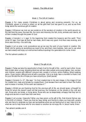 Reader 1 For many people Christmas is about giving and receiving presents. For us, as Christians, advent is a time to reflect on all the gifts that God has given to us, and so we think today about the wondrous gift of creation.