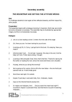 This assembly begins with a dialogue involving 2 characters. Both may use scripts, but some rehearsal is necessary. The assembly may be illustrated by appropriate images, but this is not absolutely necessary.
