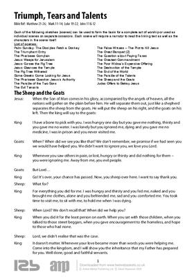 Each of the following sketches (scenes) can be used to form the basis for a complete act of worship or used as individual scenes on separate occasions. Each scene will require a narrator to read the linking text as well as the characters in the scene itself.