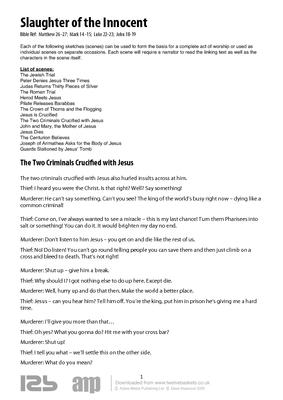 Each of the following sketches (scenes) can be used to form the basis for a complete act of worship or used as individual scenes on separate occasions. Each scene will require a narrator to read the linking text as well as the characters in the scene itself.