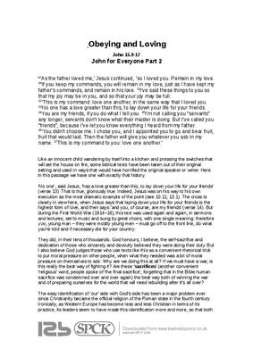 ‘No one’, said Jesus, ‘has a love greater than this, to lay down your life for your friends’ (verse 13). That is true, gloriously true. Indeed, Jesus was on his way to his own execution as the most dramatic example of the point (see 10.11; 13.1). The cross is clearly in view here, when Jesus says that laying down your life for your friends is the highest form of love, and then says ‘and you, of course, are my friends’ (verse 14). But during the First World War (1914–18), this text was used again and again, in sermons and lectures, set to music and sung by great choirs, with one single meaning: therefore you, young man – they were mostly young men – must go off to the front line, do what you’re told and if necessary die for your country...