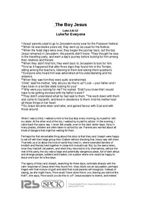 Perhaps the first remarkable thing about this story is that Mary and Joseph were happy to set off with their large group from Galilee without checking that Jesus was with them. That tells us a lot about the kind of world they lived in, where extended families of kinsfolk and friends lived together in close-knit mutual trust. But, by the same token, once they had left Jerusalem, and when they returned to it by themselves, without the rest of the party, the city was a large and potentially dangerous place, full of dark alleys and strange people, soldiers and traders, not a place where one would be happy to leave one’s son for a few days...