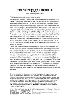 So we continue with our chess game, with Paul playing the role of grand master and taking on all the players of Athens at once. We have seen how he agrees with the Academy that it is indeed impossible, granted what was available to them, to know very much about the true God. Ah but, he says, God himself has been aware of this difficulty, and has now brought this ‘time of ignorance’ to an end. We have seen that, in typically Jewish style, and building on the critique of idols and temples throughout Jewish scripture and tradition, he rejects utterly the whole idea of temples, sacrifices and statues of the gods. Instead, he tells the good news of a creator God who made the world and everything in it...
