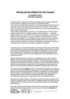 A haunting song by Joni Mitchell describes a clarinet player standing by the side of the road in a busy city. He wasn’t like ordinary buskers, playing mediocre music in a bored sort of way and hoping for enough small change from passers-by to make it through the next day or two. He was brilliant. He stood there, with music pouring out of the instrument, seeming to come from his very soul. And he wasn’t collecting money. He was doing it for free...