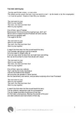 A meditation/prayer on the story of the Pharisee and the Tax Collector at prayer using the old song "One man went to mow" Can be used for two voices – or one voice. The refrain can be sung to the tune “one man went to mow” – by the leader or by the congregation or it can be spoken - however it best fits your situation.
