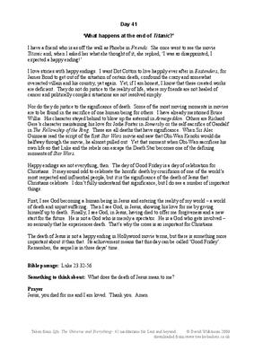 Thoughts taken from TV, Books and life experiences on various topics and given a Christian slant to stimulate thoughts. The topic here for Day 41 is 'The ultimate sacrifice'. Uses reference to such films & TV shows as 'Friends', Titanic', 'Eastenders' and 'The Fellowship of the Ring', and concludes with reference to Good Friday.
