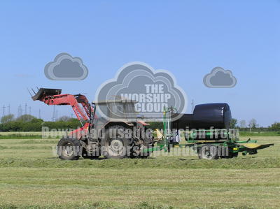 The 5th image in a series showing silage being made. Silage is made from cut grass which has been left to dry in the sun (hay), it's then baled up, wrapped in plastic, stored, then used during the winter months to feed the farm animals when there isn't much grass around.