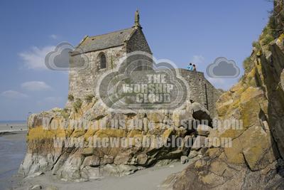 Small stone church on rock outcrop behind Mont Saint Michel Brit