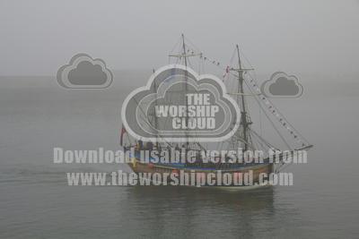 The replica of the Endeavour emerges from a thick sea fret at Whitby