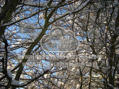 Winter scene close up of blue sky peeping through snow clad branches and twigs. Macro lens used to obtain close up by Audrey Hogan