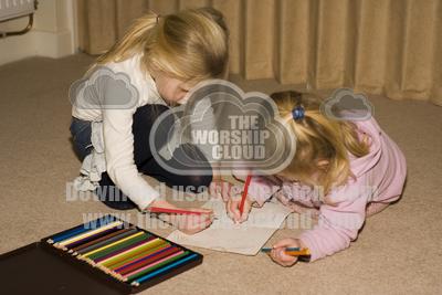 Two young girl siblings aged four and two drawing with coloured pencils indoors UK