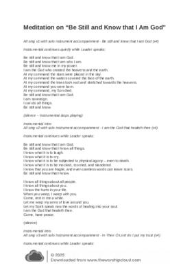 A meditation based on the worship song "Be still and know that I am God". This meditation has been used in various services and places, and has been found to be a highly effective meditation which focusses on Faith, Healing and Trust.