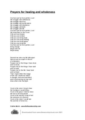 Prayers for healing and wholeness in our lives, and a reminder that healing is more than just a cure for the particular illness that affects us now; it affects body, mind and spirit - it's about knowing peace and assurance in our lives, despite the situation we find ourselves in at the present moment.