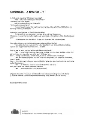 A poem about Christmas contrasting the first Christmas with Christmas now. Finishes with a challenge to the listener.