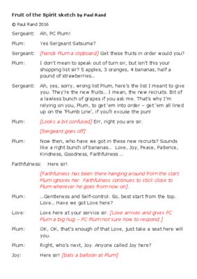 Plum: Now then, who have we got in these new recruits? Sounds like a right bunch of bananas… Love, Joy, Peace, Patience, Kindness, Goodness, Faithfulness …