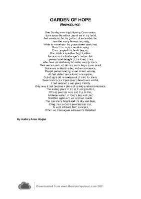 This poem was written following a Sunday service at Newchurch Parish church 2010.I called it Garden of Hope because this church memorial garden was so pretty and reminded me of the hope held out to us of the resurrection and of seeing lost loved ones again.Yes we miss those who have gone before us but all is not lost because of Jesus. By Audrey Hogan