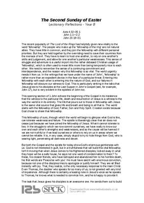 The recent popularity of The Lord of the Rings has helpfully given new vitality to the word ‘fellowship’. The people who make up the ‘fellowship of the ring’ are not natural allies. They have little in common, and they join the fellowship with different personal priorities. But they are held together by the overriding need to save their countries from the menace of evil. They have to learn to trust one another, to rely on one another’s skills and judgement, and allow for one another’s particular weaknesses. This sense of struggle and adventure is a useful import into the rather debased Christian usage of ‘fellowship’, which is often used to mean little more than being temporarily nice to each other...
