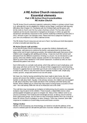 The RE Active Church workshop material is tailored to children in primary school Years 3–6, although this can be adapted for children at Key Stage 1 and those with learning difficulties (see Chapter 11). Familiarity with the Christian faith and life grows with termly visits to church over the four years of primary school. The four-year cycle of material can be reused, improved or changed as necessary. In 2010, we gave the introduction and plenary conclusion to the summer workshop a World Cup slant and, in 2012, will look to give it an Olympics twist. Please feel free to adapt the material to your own circumstances or to reflect national events...